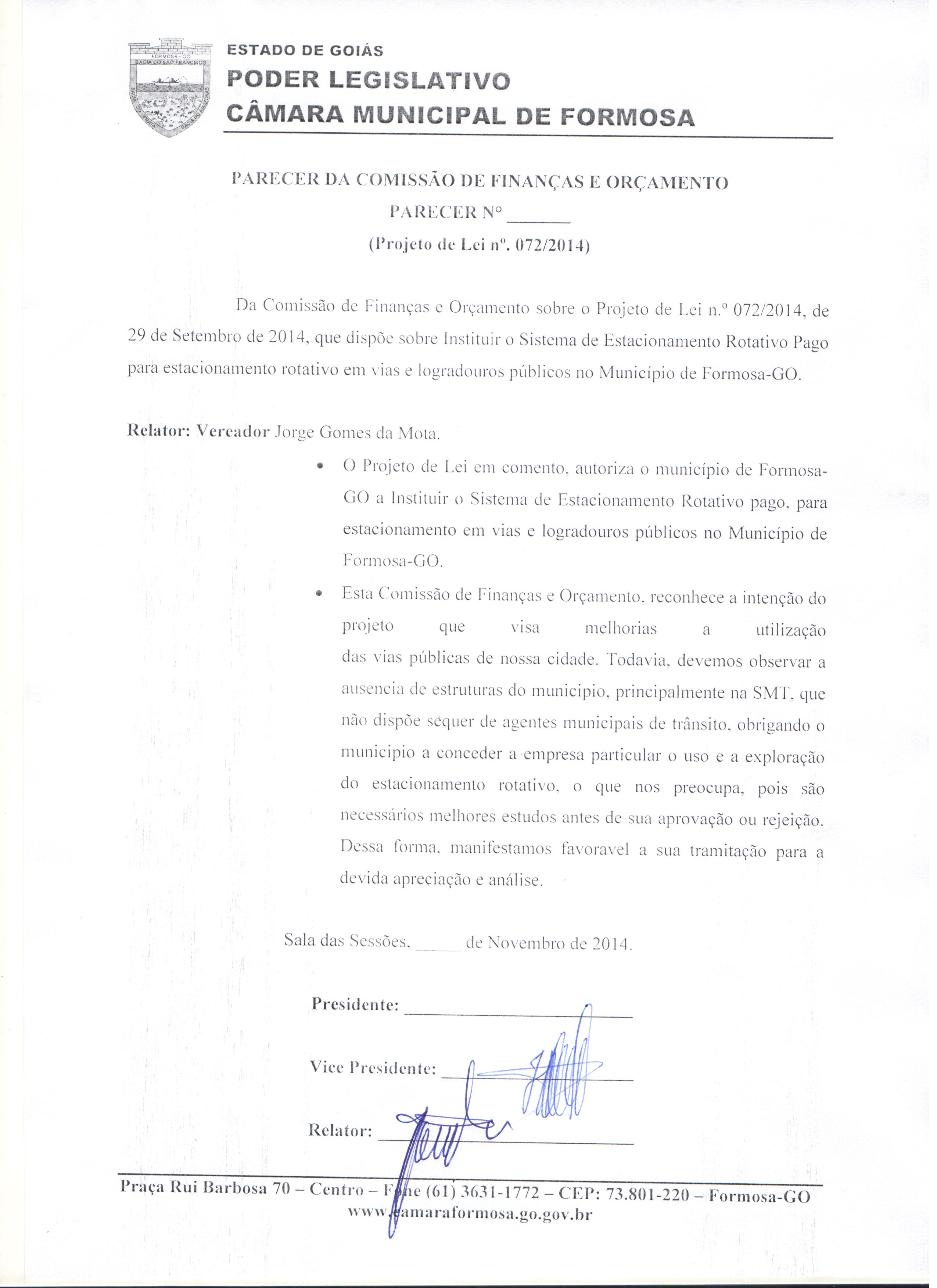 PARECER AO PLO 072-14 DE AUTORIA DO PODER EXECUTIVO.