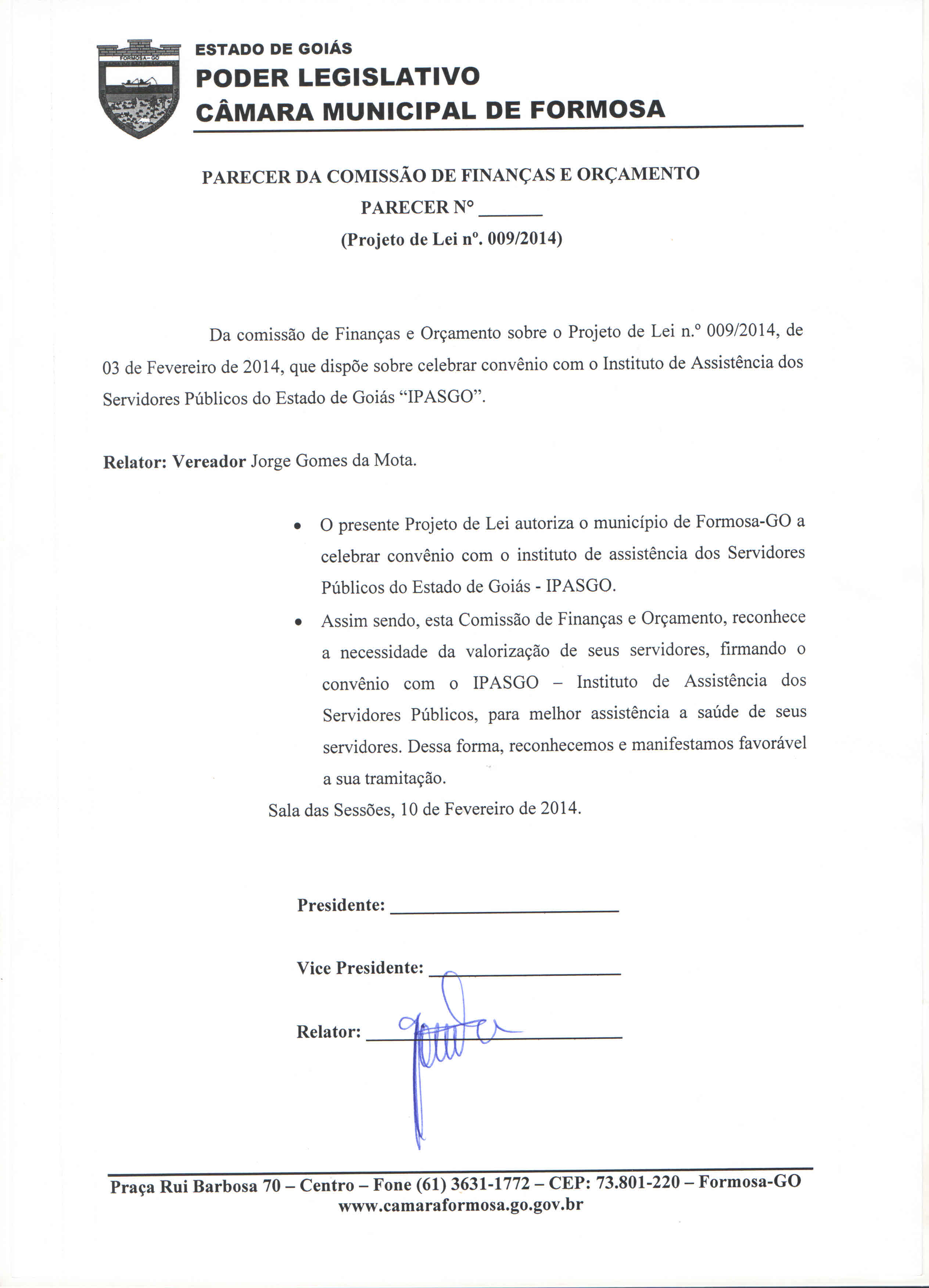 Ementa: PARECER AO PROJETO DE LEI Nº 009, DE 03 DE FEVEREIRO DE 2014, PROPOSTO PELO PODER EXECUTIVO.