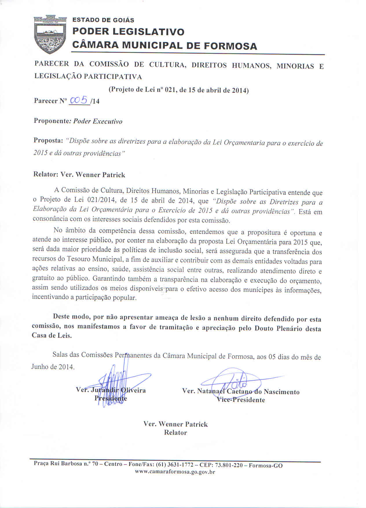 Ementa: PARECER AO PROJETO DE LEI 021/2014 DE AUTORIA DO PODER EXECUTIVO.