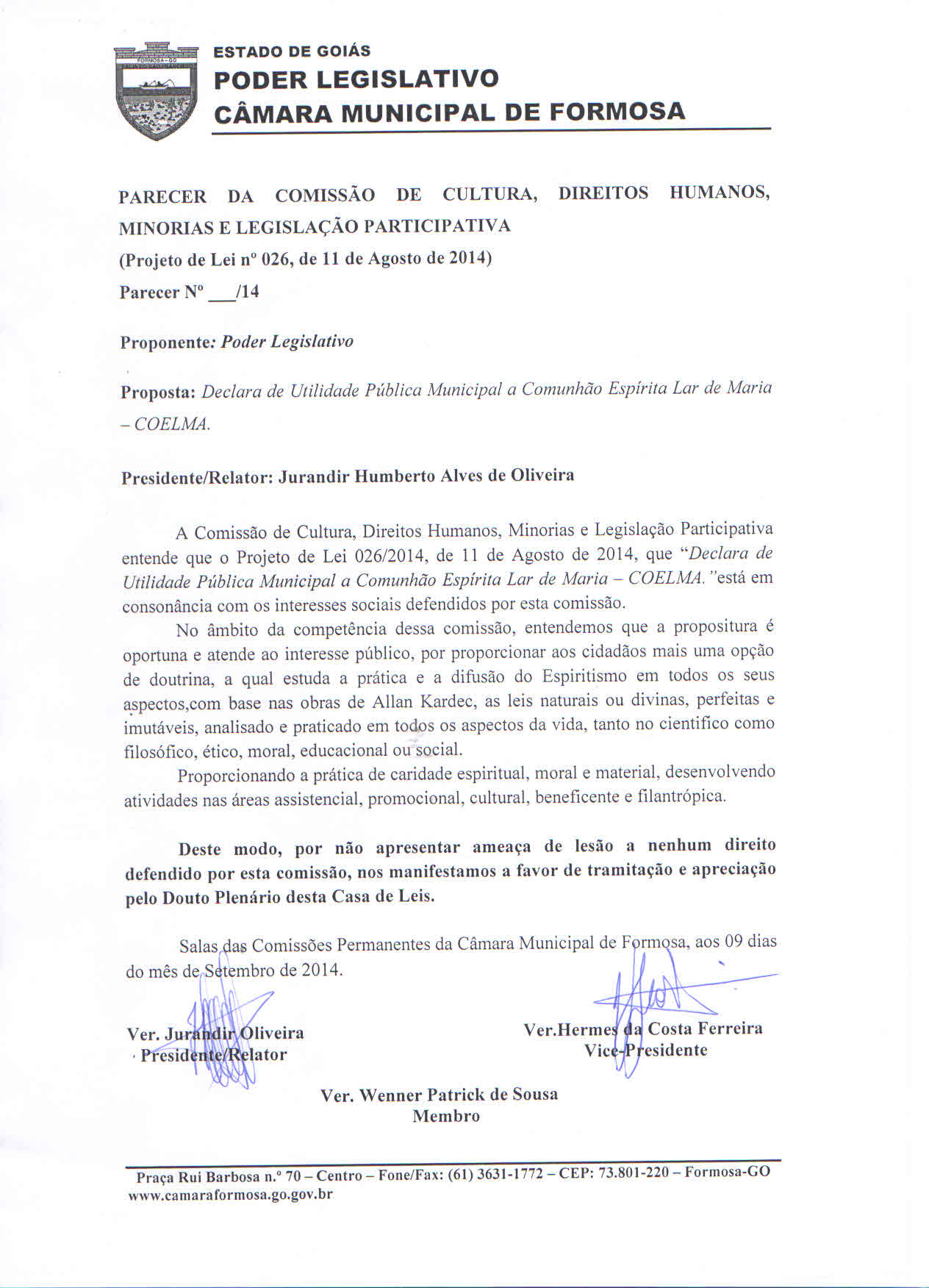 Ementa: PARECER AO PLO 026/14 DE AUTORIA DO PODER LEGISLATIVO.