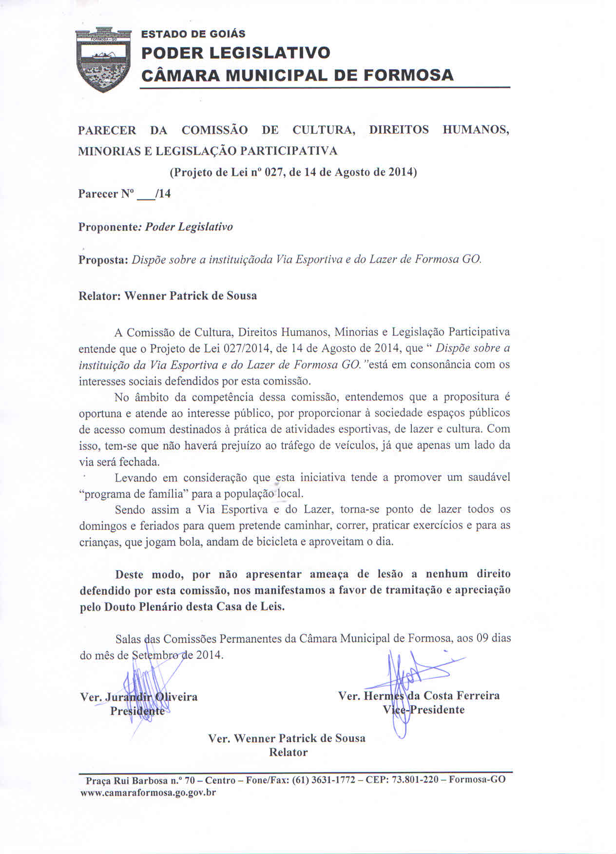 Ementa: PARECER AO PLO 027/14 DE AUTORIA DO PODER LEGISLATIVO.