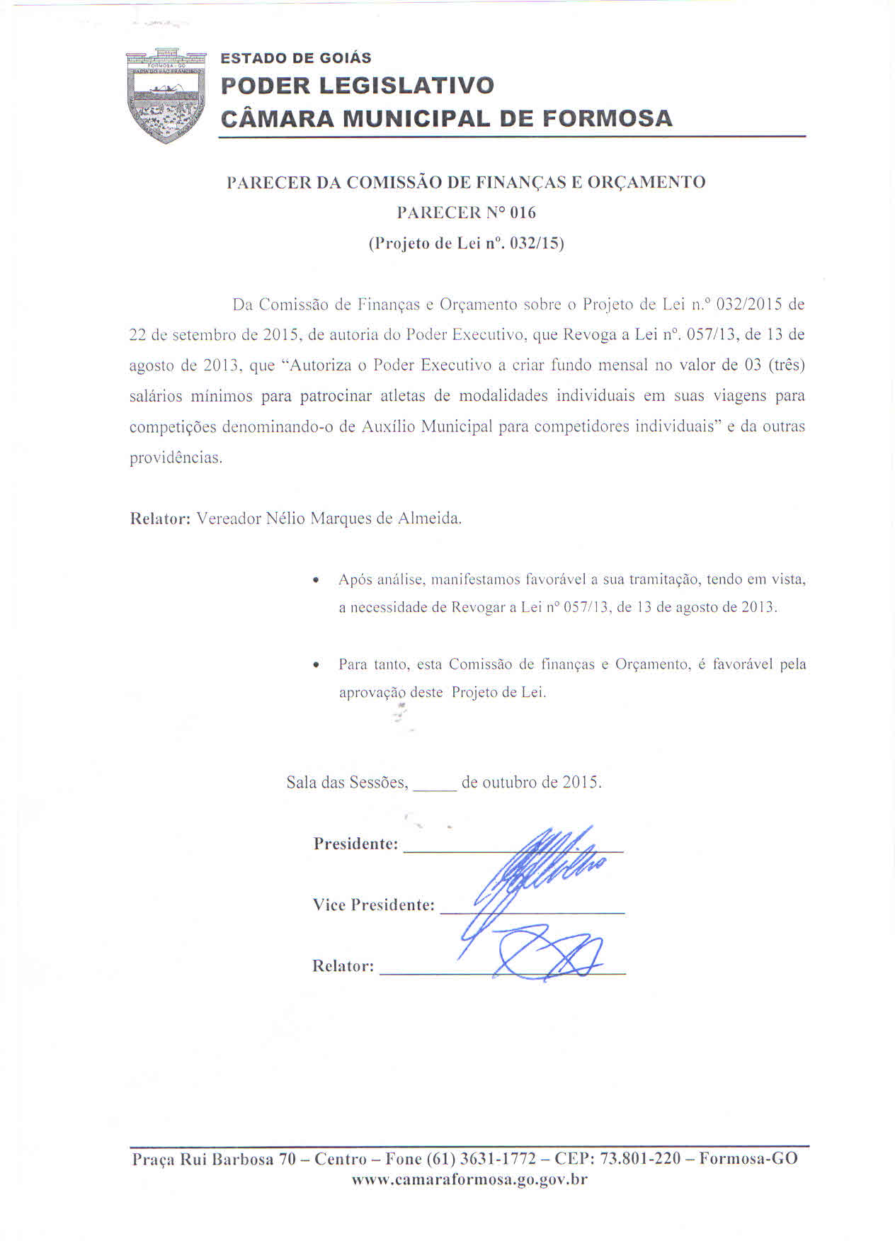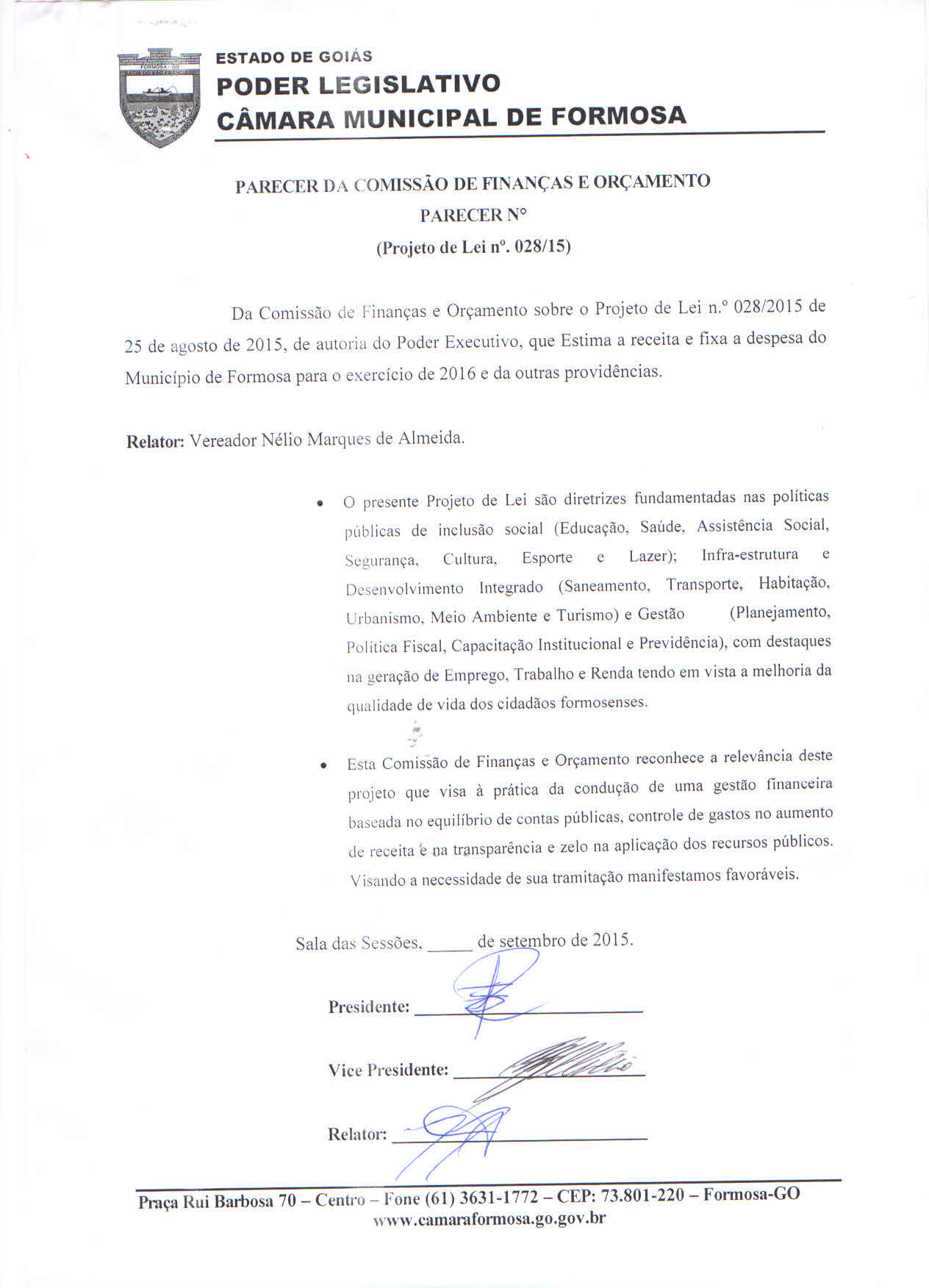 PCFO 16/2015 - Parecer Comissão de Finanças e Orçamento