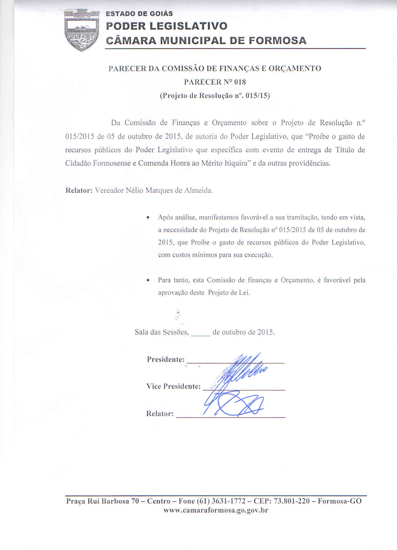 PCFO 18/2015 - Parecer Comissão de Finanças e Orçamento