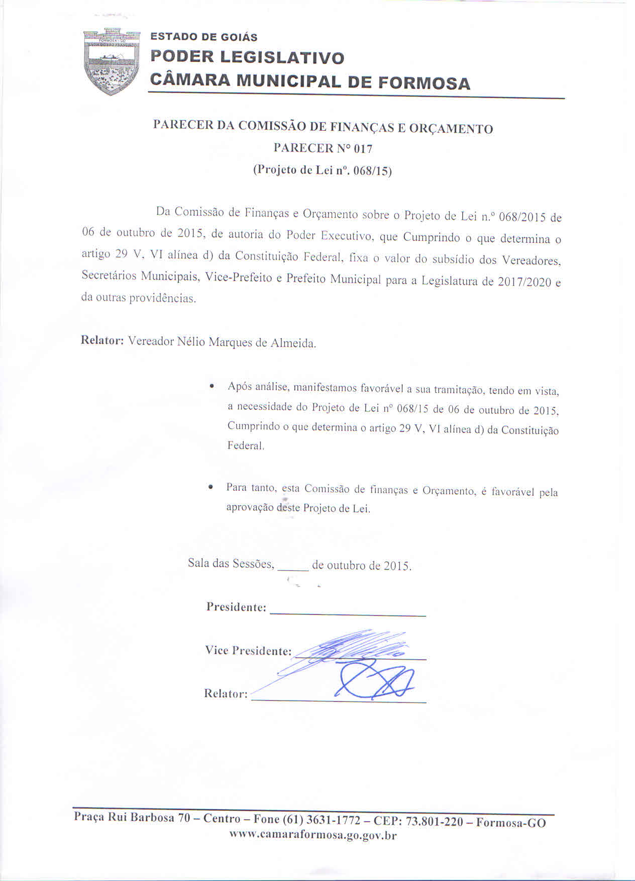 PCFO 17/2015 - Parecer Comissão de Finanças e Orçamento