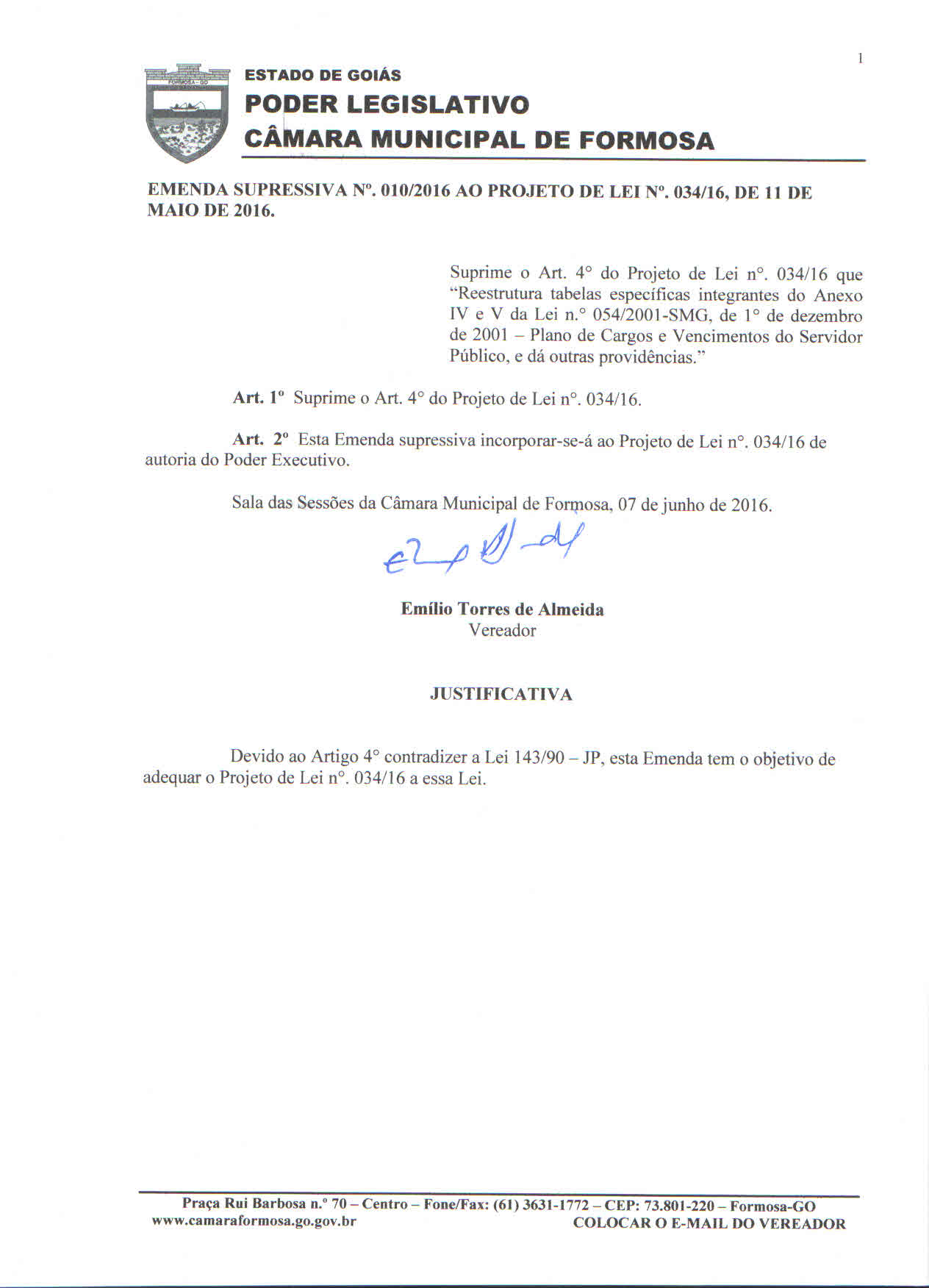 Ementa: SUPRIME O ART. 4º DO PROJETO DE LEI N°. 034/16 QUE "REESTRUTURA TABELAS ESPECÍFICAS INTEGRANTES DO ANEXO IV E V DA LEI N.° 054/2001-SMG, DE 1° DE DEZEMBRO DE 2001 – PLANO DE CARGOS E VENCIMENTOS DO SERVIDOR PÚBLICO, E DÁ OUTRAS PROVIDÊNCIAS."