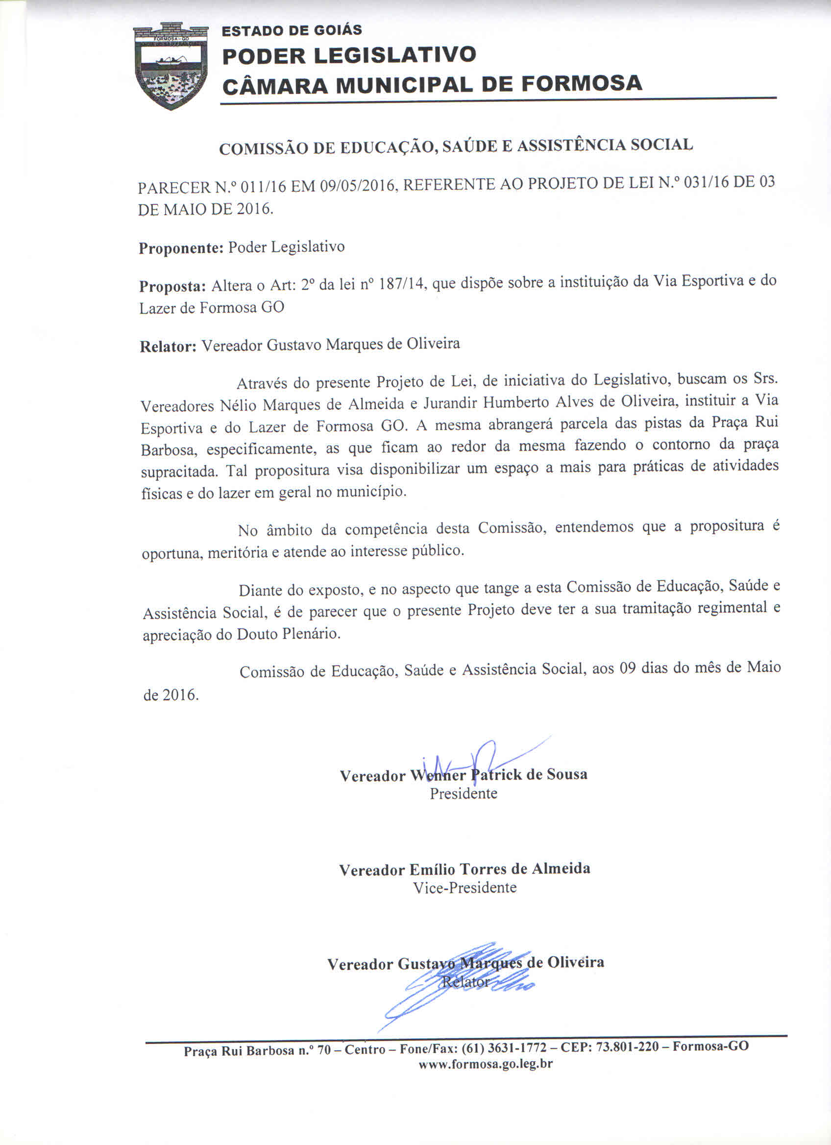 Ementa: PARECER AO PROJETO DE LEI ORDINÁRIA 031/16 DE AUTORIA DO PODER LEGISLATIVO.