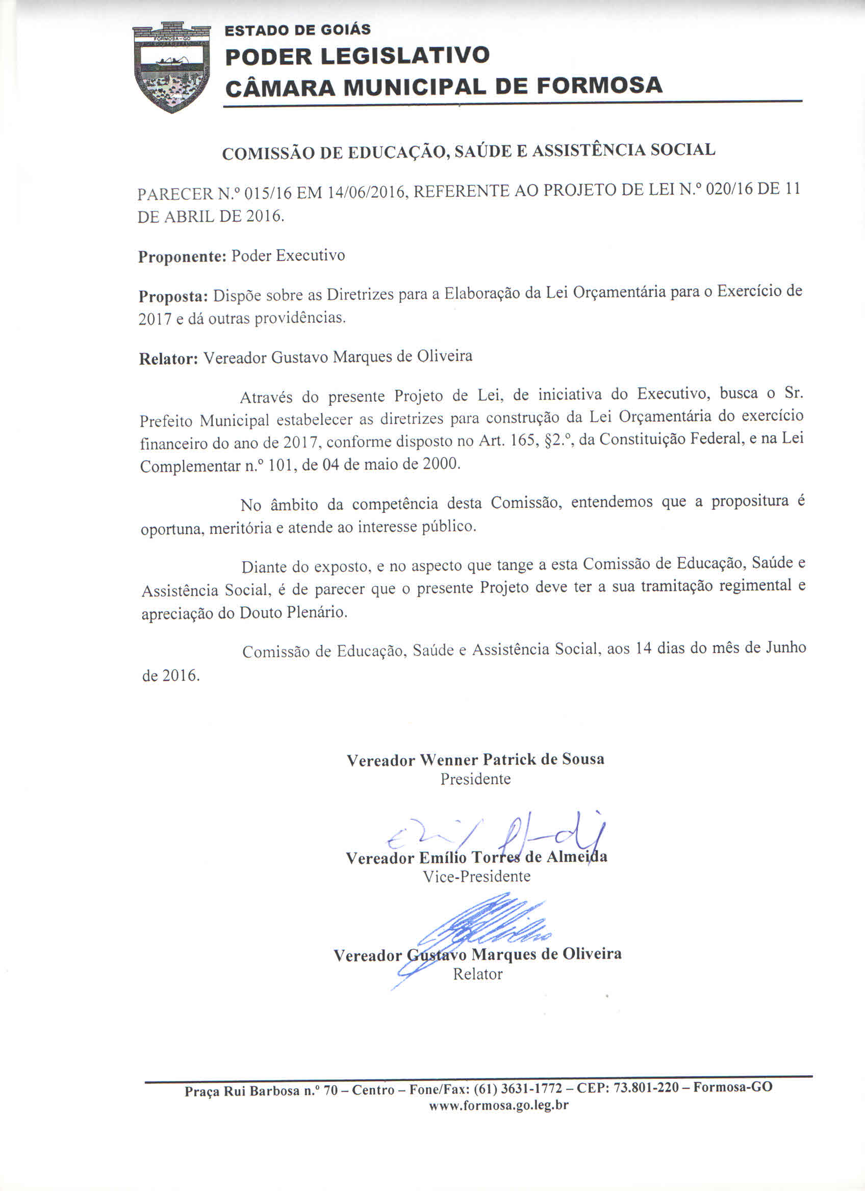 Ementa: PARECER AO PROJETO DE LEI ORDINÁRIA 015/16 DE AUTORIA DO PODER LEGISLATIVO.