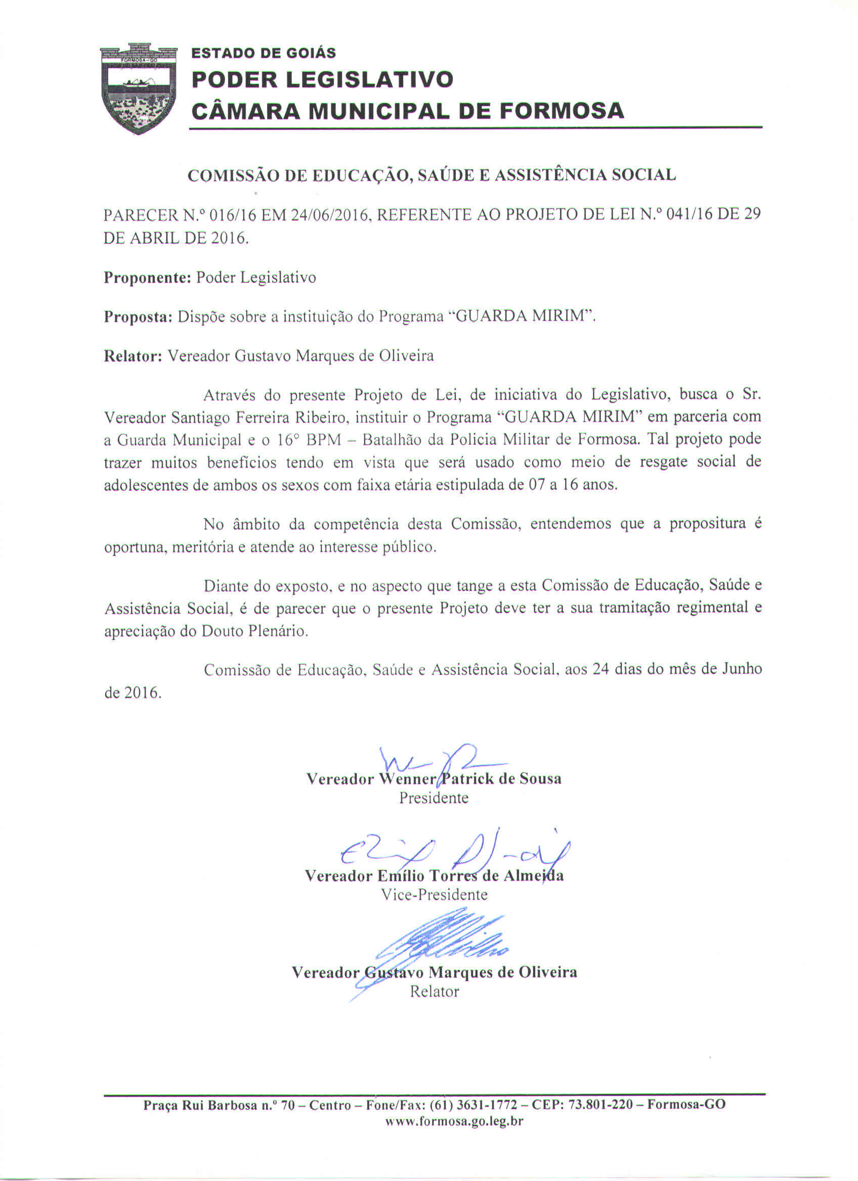 Ementa: PARECER AO PROJETO DE LEI ORDINÁRIA 007/16 DE AUTORIA DO PODER LEGISLATIVO.