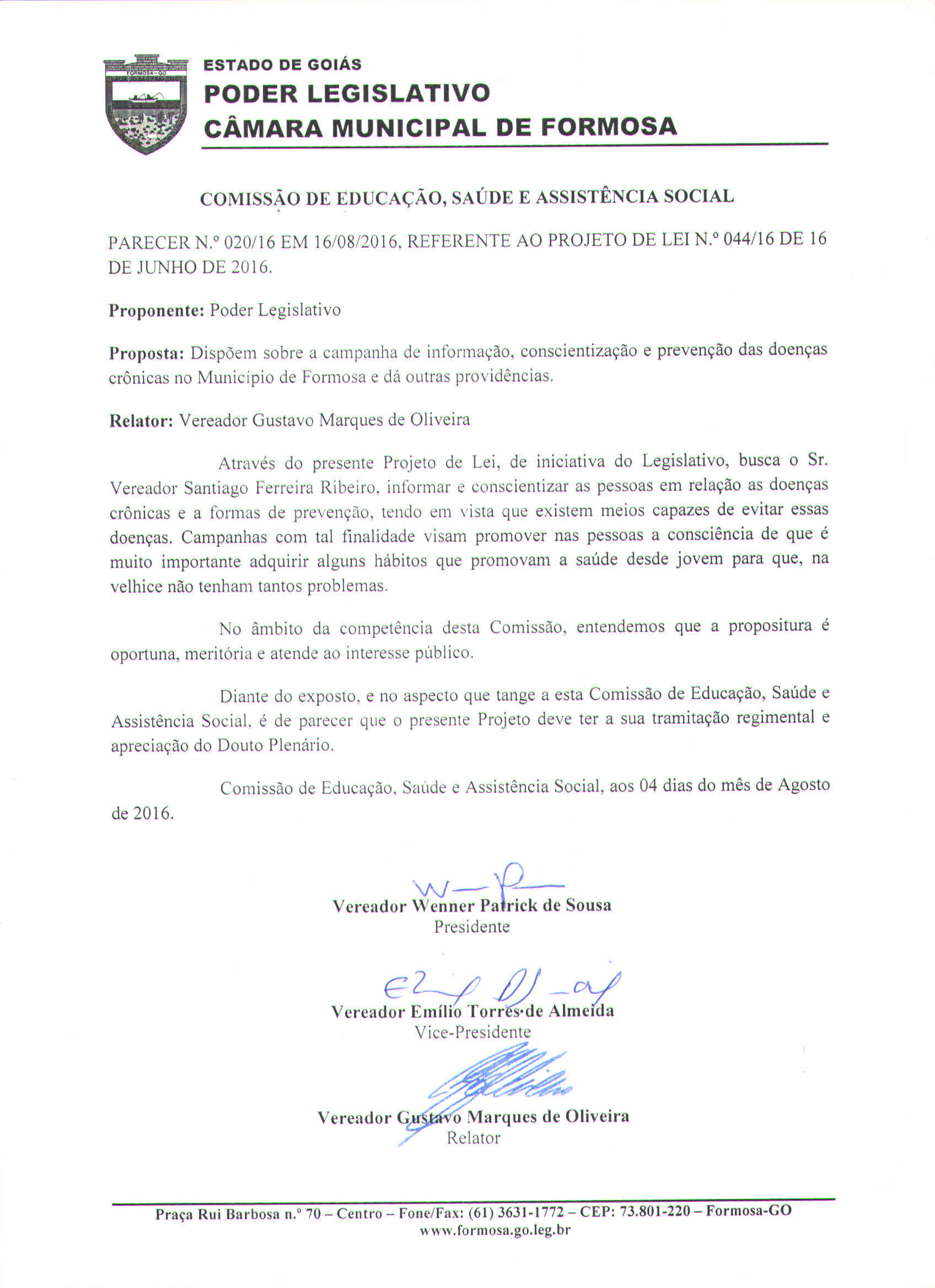 Ementa: PARECER AO PROJETO DE LEI ORDINÁRIA 020/16 DE AUTORIA DO PODER LEGISLATIVO.