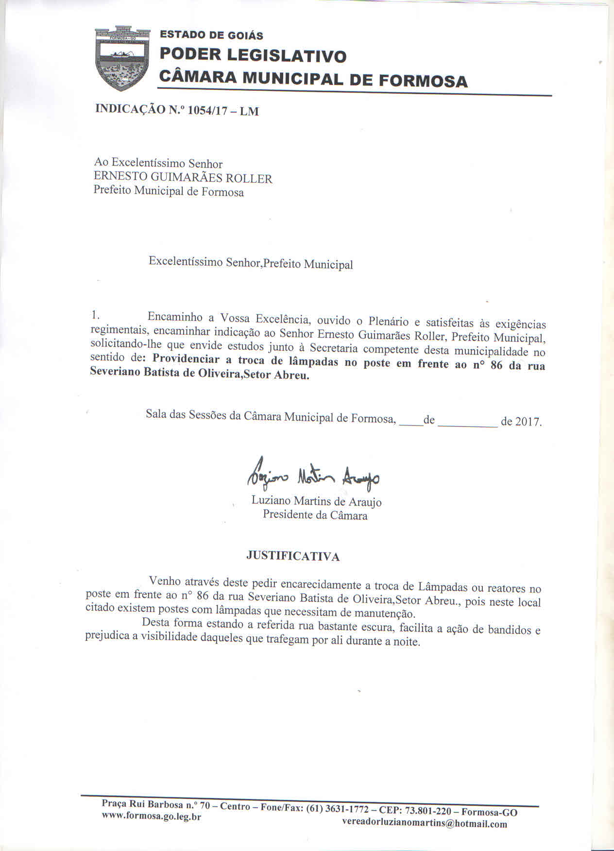 Ementa: PROVIDENCIAR A TROCA DE LÂMPADAS NO POSTE EM FRENTE AO N° 86 DA RUA SEVERIANO BATISTA DE OLIVEIRA, SETOR ABREU.
