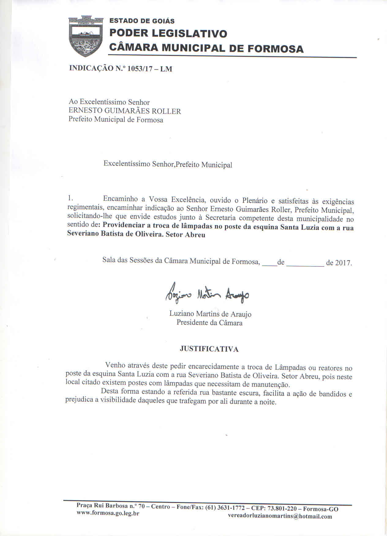 Ementa: PROVIDENCIAR A TROCA DE LÂMPADAS NO POSTE DA ESQUINA SANTA LUZIA COM A RUA SEVERIANO BATISTA DE OLIVEIRA NO BAIRRO ABREU.