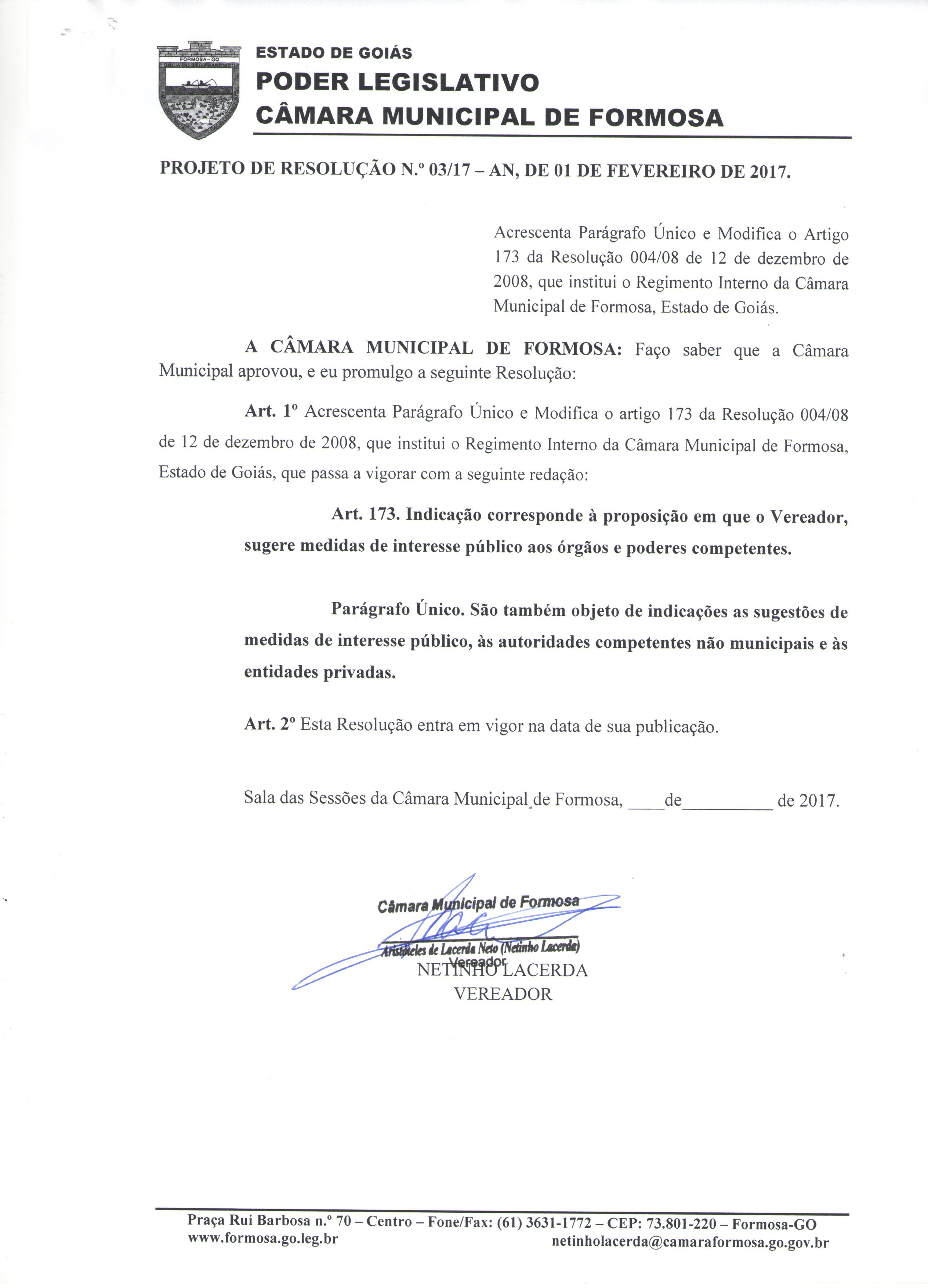 Ementa: ACRESCENTA PARÁGRAFO ÚNICO E MODIFICA O ARTIGO 173 DA RESOLUÇÃO 004/08 DE 12 DE DEZEMBRO DE 2008, QUE INSTITUI O REGIMENTO INTERNO DA CÂMARA MUNICIPAL DE FORMOSA, ESTADO DE GOIÁS.