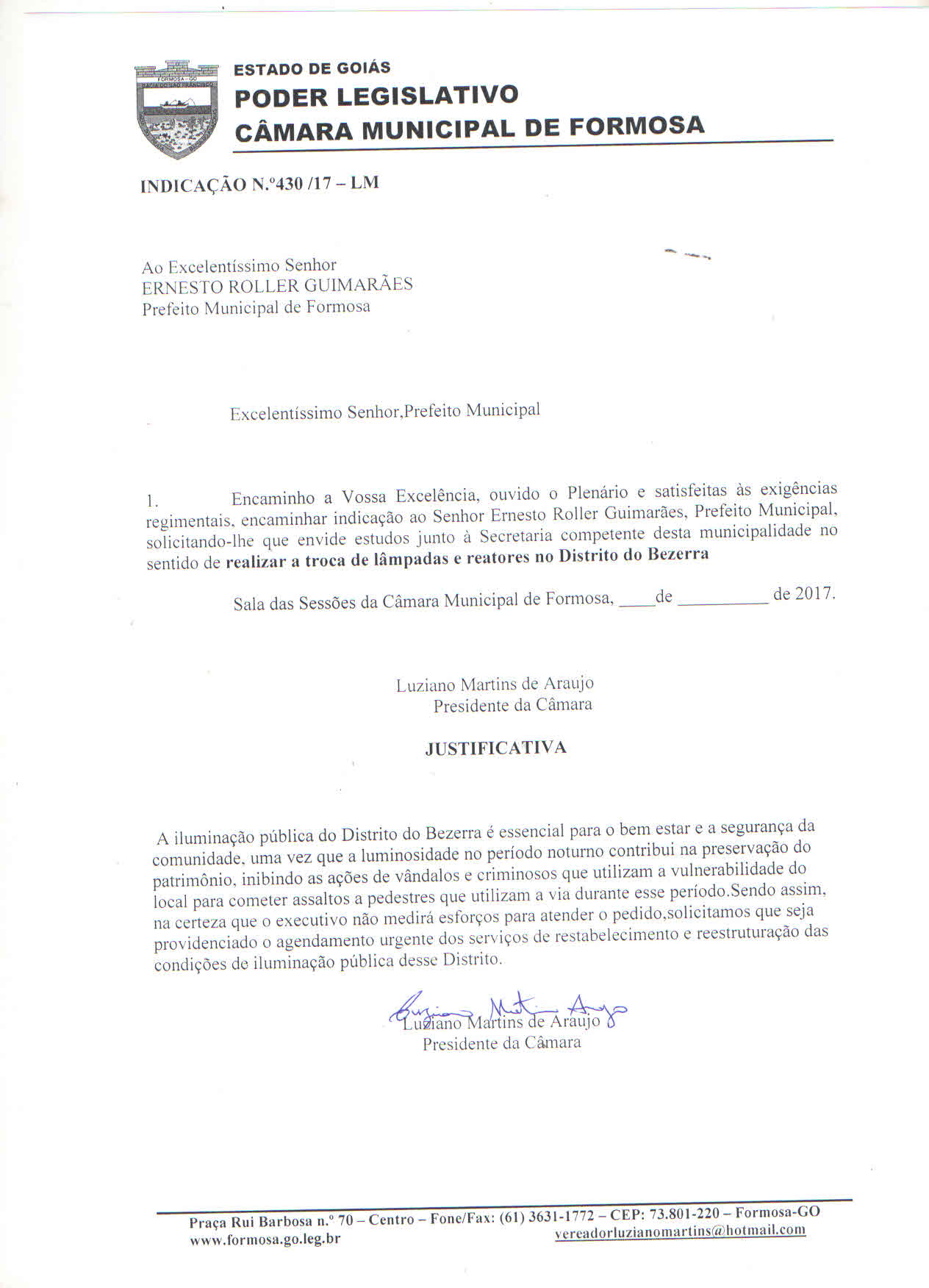 Ementa: REALIZAR TROCA DE LÂMPADAS E REATORES NO DISTRITO BEZERRA.