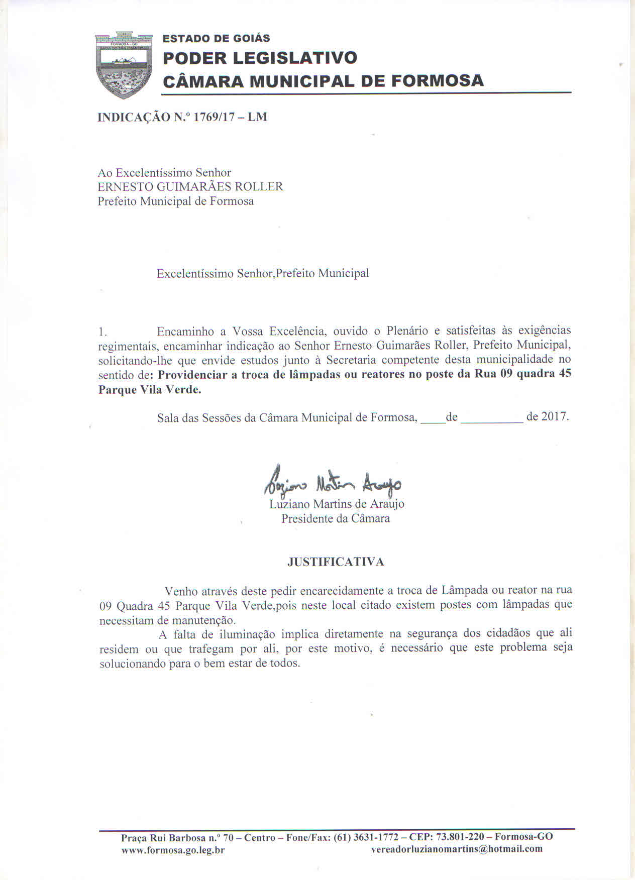 PROVIDENCIAR A TROCA DE LÂMPADAS OU REATORES NO POSTE DA RUA 09 QUADRA 45 PARQUE VILA VERDE - |